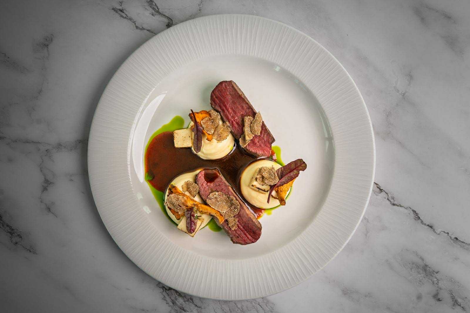 restovanými liškami, pečeným celerem a jalovcovým demi glace