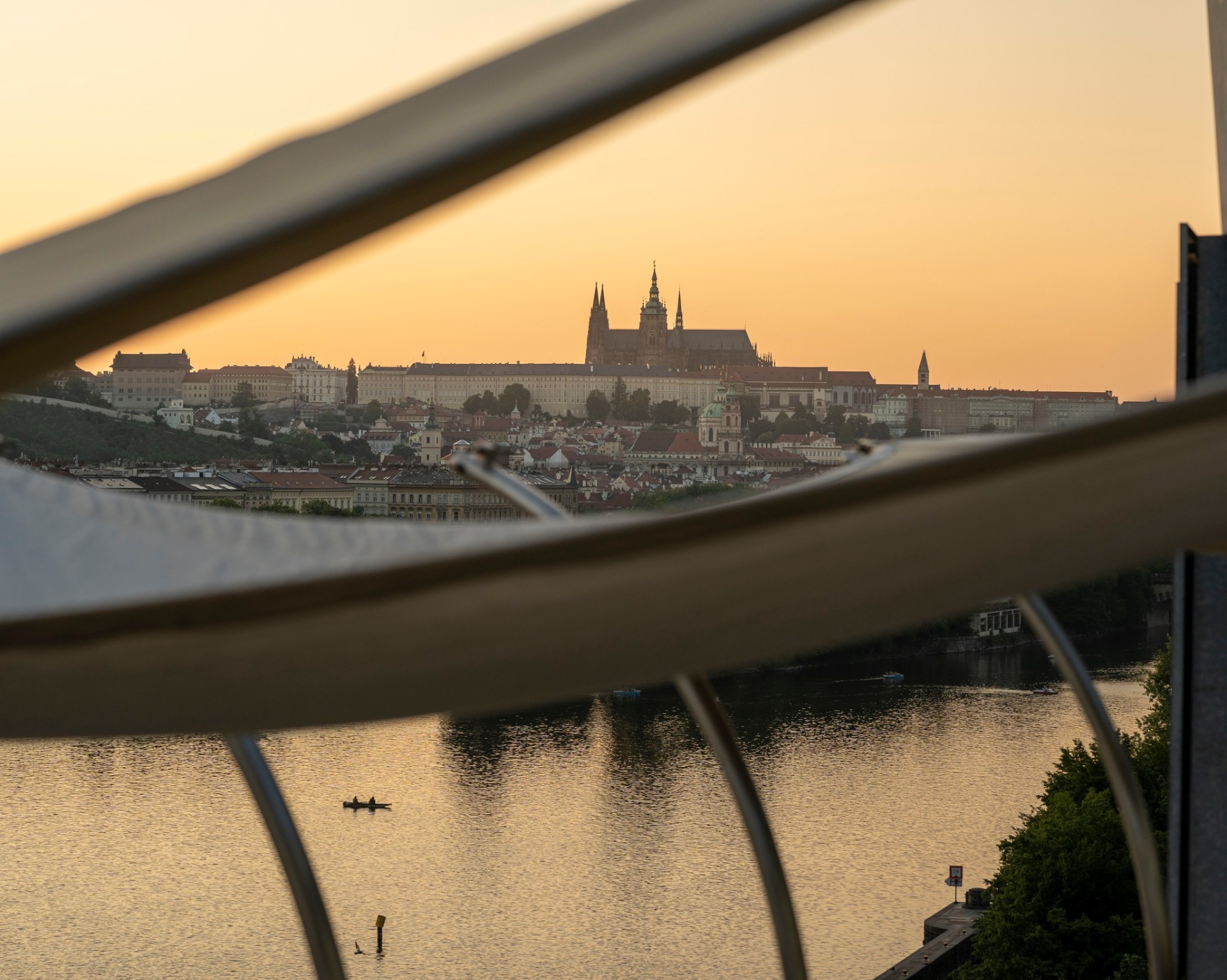 Moderní architektonická restaurace s fantastickým výhledem na Pražský hrad a Hradčany, ze 7. patra Tančícího domu.